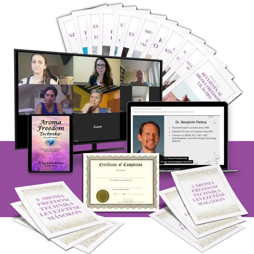 Ez az átfogó tanfolyam az Aroma Freedom elméleti és gyakorlati vonatkozásait egyaránt magában foglalja. A tartalmat Zoom/Google Meet videokonferencia, valamint Dr. Perkus előre rögzített videói magyar felirattal ellátva és más online források szolgáltatják.